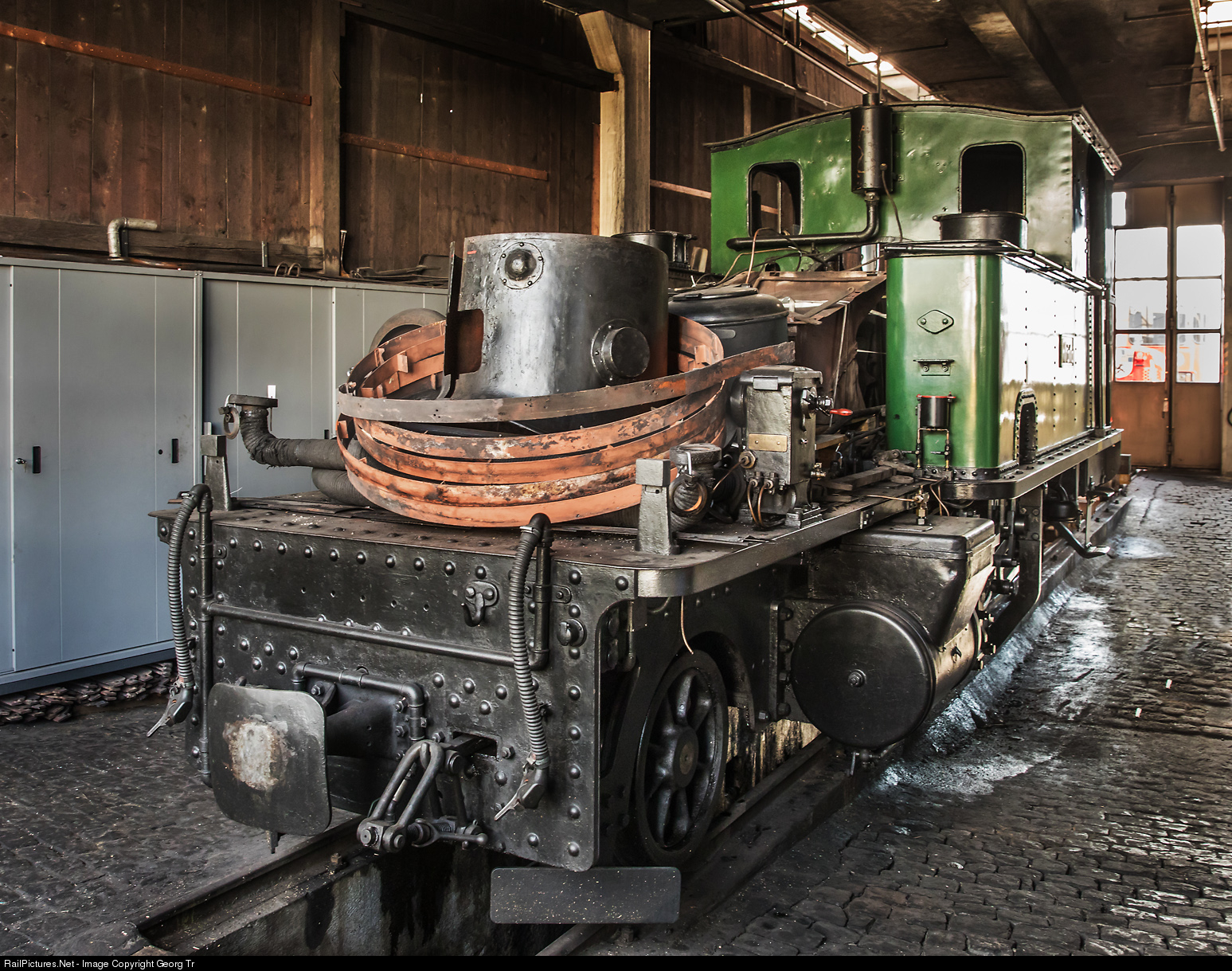 2-6-0 T "Mogul" steamlocomotive G 3/4 # 1 "Rhätia" of the RhB, built in 1889 for the narrow gauge railway Landquart-Davos (LD), in the shed in Landquart. The 250 Hp locomotive will undergo a large revision in the next years, the needed money of 940 000 swiss francs was collected by the PROJEKTGRUPPE RHÆTIA, a joint project group of Dampffreunde der Rhätischen Bahn and Club 1889. The boiler of the locomotive was removed already for exactly inspection. Loaded onto the frame of the locomotive are some parts now, like the steam and sand dome covering, the steel tails of the boiler cladding and the ash box, and not visible, the chimney. In some years, the very first steamlocomotive of the RhB (respectively the predecessor railway Landquart-Davos Bahn) will run again in a classic black livery with brass lettering "L-D" # "1" and with the name "RHÆTIA", like when she pulled the inauguration train of the Landquart-Davos-Bahn on september 29th, 1889 between Landquart and Klosters.
