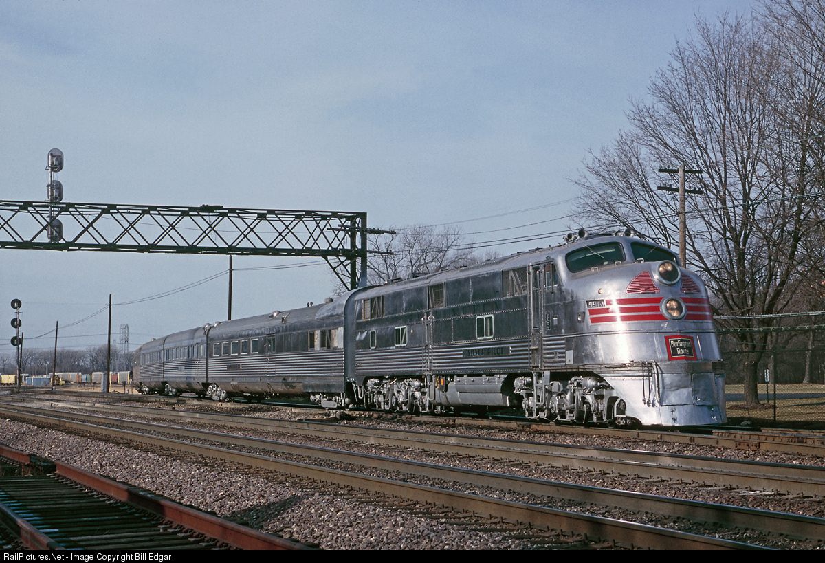 Illinois Railroad Museum's CB&Q Nebraska Zephyr passenger train went on loan to BN in December 1993, and is seen here on its ferry trip to Ft. Worth, TX. The train is exiting the Belvidere-Rockford branch of the CNW, and will cross over the mainline tracks here at West Chicago, IL, then enter the BN branchline down to Aurora. A BN Geep will tow the train backwards to Aurora where it will reach the BN mainline and head southwest toward Kansas City and Ft. Worth.