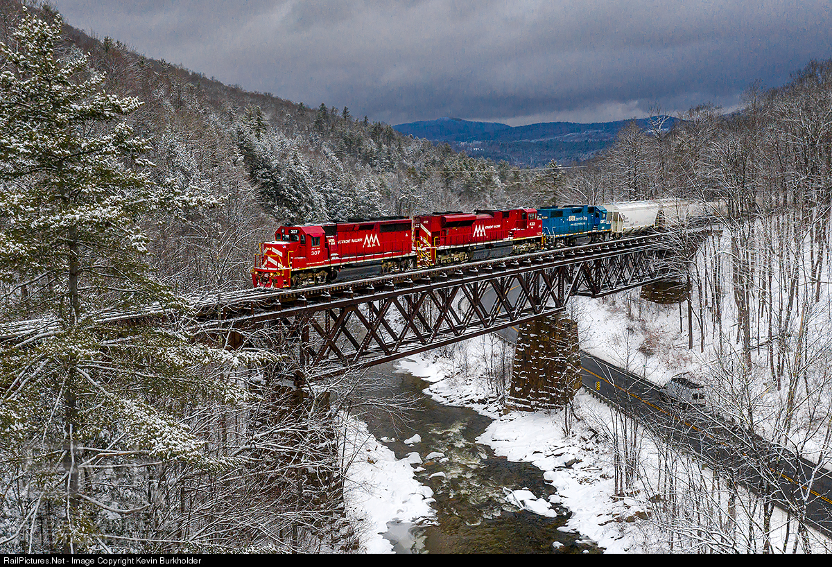 Vermont Rail System may be looking to standardize the loco fleet with GP38-2 models, making 2 of the 3 units on this GMRC train 263 surplus. VTR GP40-2 307, leads VTR SD70M-2 432 and GMTX GP38-2 2205 over the Mill River at Cuttingsville, VT.