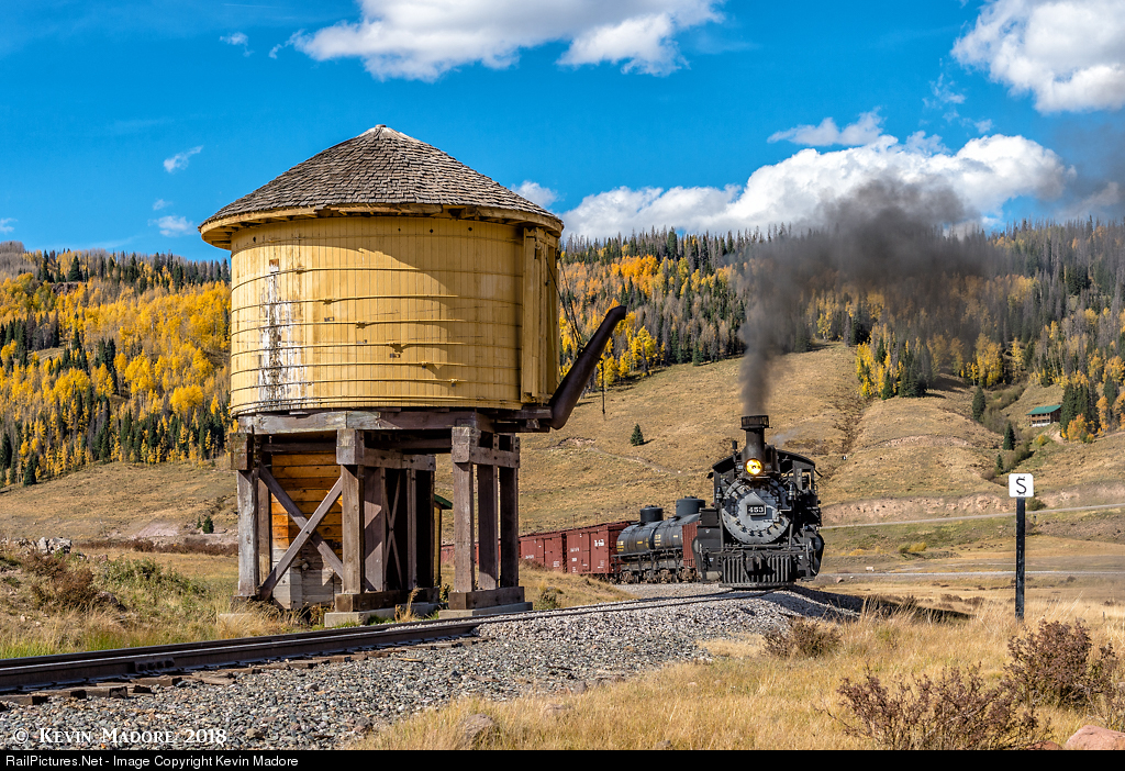 Of course, the locomotive depicted here is really DRGW 463, lettered for her dear, departed sister, which was long ago converted into razor blades. The 463 was lettered as 453 for a 2018 photographic charter that was organized by the Friends of the Cumbres & Toltec Scenic Railroad. Speaking of the Friends, they have been instrumental, not only in the refurbishment of historic equipment, such as freight cars, but also in the refurbishment and maintenance of some of the historic structures along the line. A classic example is the tank seen here. For many years, the Los Pinos Tank had fallen into disrepair and was non-functional. For the most part, it was not missed, because the large, K-36 Locomotives that are used on the daily passenger trains are superheated engines, and do not require water between Cumbres Pass and Osier. But an effort on the part of the Friends in 2014 repaired the tank and got it working again, and none too soon. Since that time there have been periodic problems with the standpipe on Cumbres Pass, and this tank really came in handy, supporting daily operations. The tank has also proven quite useful on photo excursions, such as this one, because they tend to use up water much more quickly than regular operations. The extra water stop also supports smaller, visiting locomotives, some of which do not have superheat, and do not carry large supplies of water.