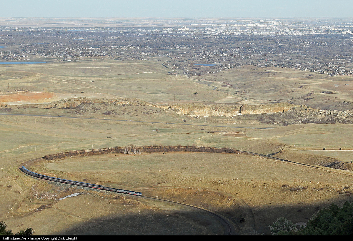 | The time is 5:41PM and Amtrak #6 is on time for a 6:30PM arrival in Denver. This location is the oft photographed Big Ten curve, so named for its degree of curvature. This trackage is in the transition from the Great Plains to the Rocky Mountains and was conceived and laid out by the veteran locating engineer H.A. Sumner at the beginning of the 20th century. Before long that shadow at the bottom of the image will have the entire curve in darkness. |