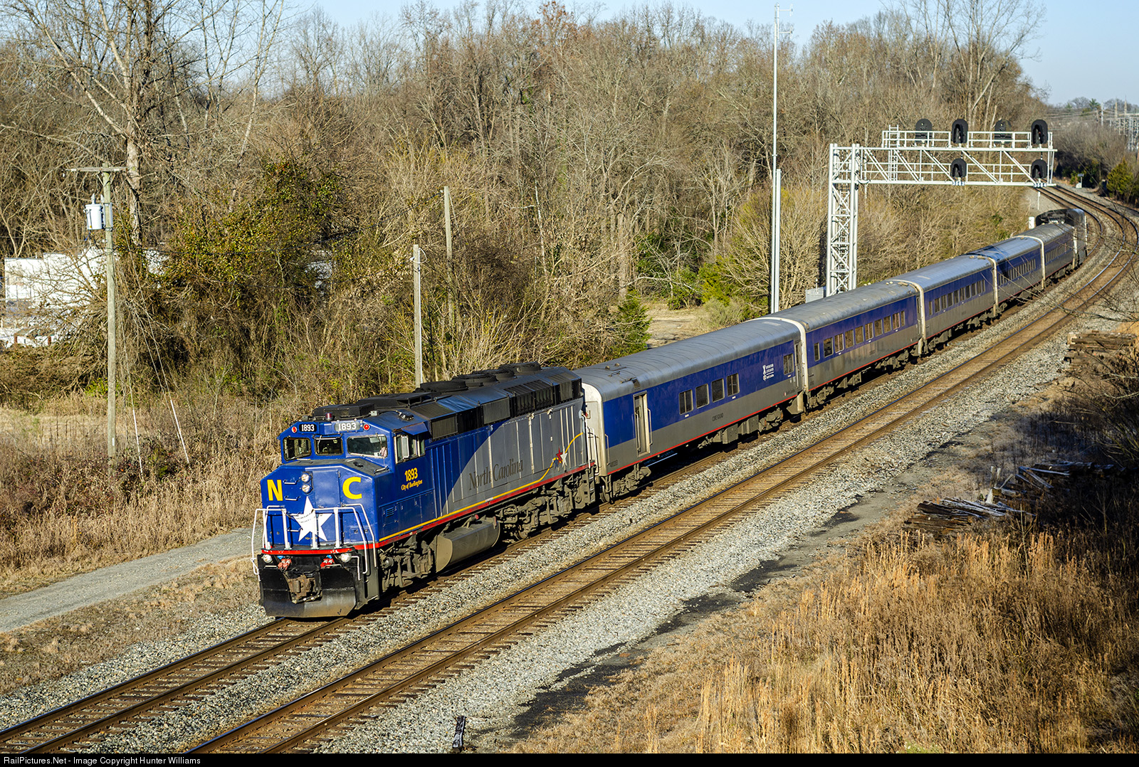 | Southbound Amtrak train 73 - the morning Piedmont service - cruises through the intermediate signals in Concord, NC on its way to its final stop in Charlotte on December 19, 2019. |