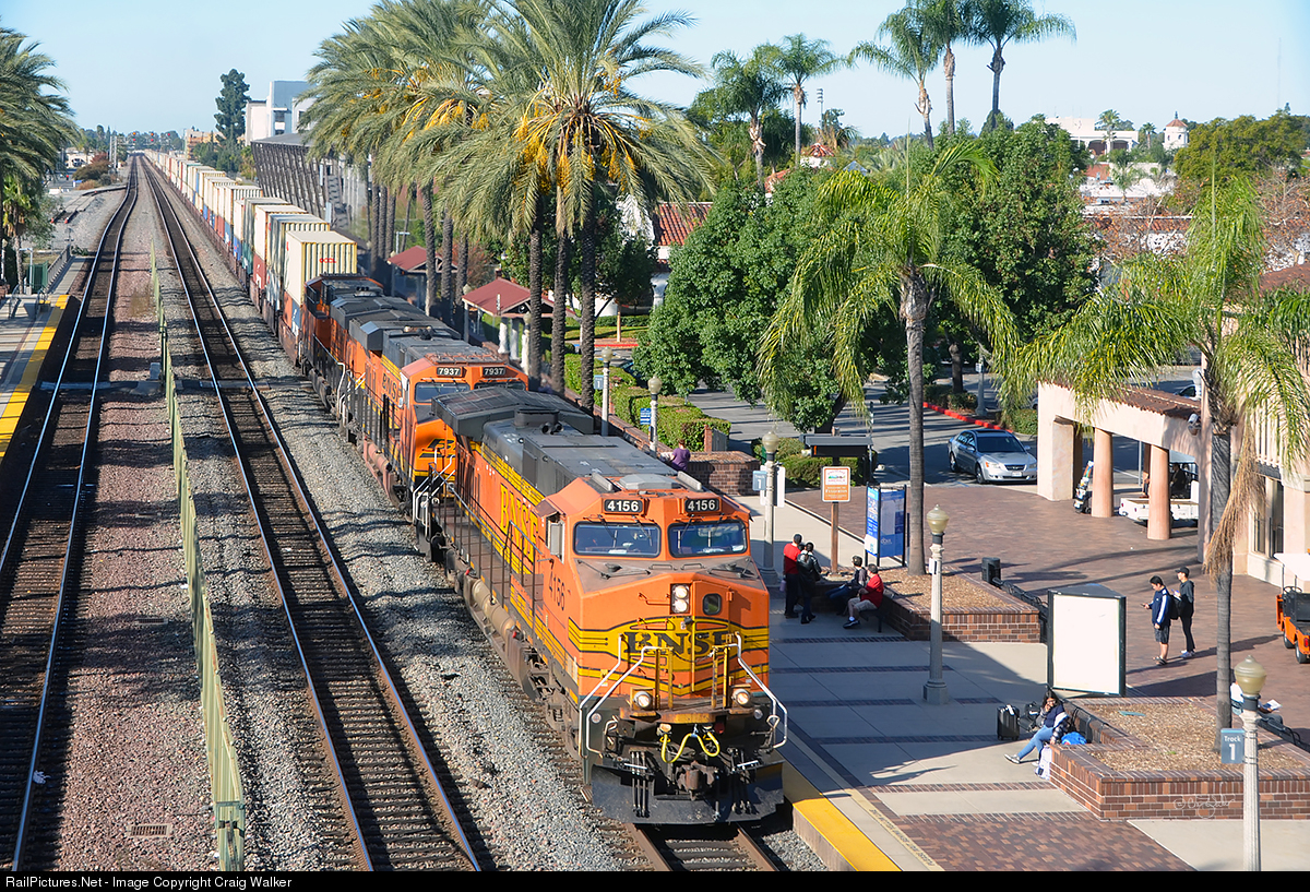 Passing through the Amtrak/Metrolink station in Fullerton, California, on December 15, 2019, is BNSF Railway train S-LBEMEM1-14, which originated in Long Beach CA and is heading to Memphis TN. Three GE diesels are up front (Dash 9-44CW 4156, ES44C4 7937 and ES44C4 8144) with two more GEs on the rear (ES44C4 8248 and Dash 9-44CW 5480).