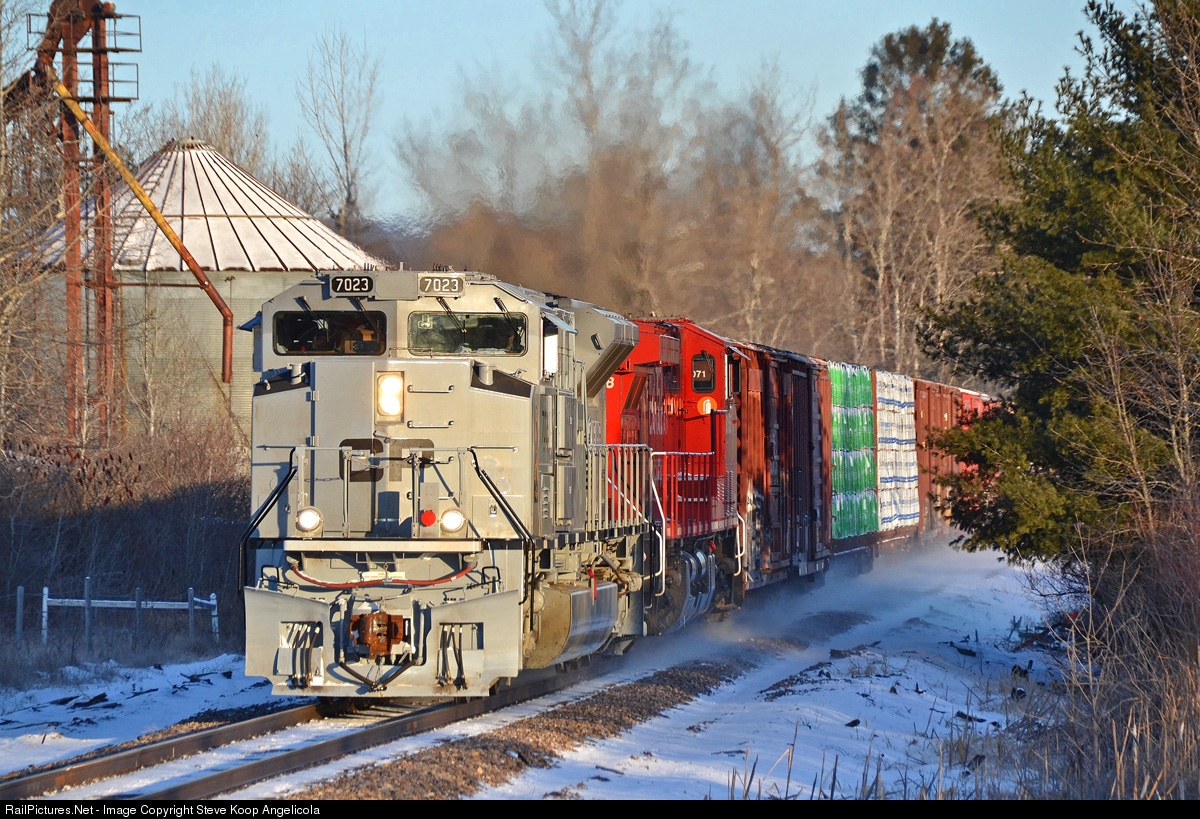 | The temperature is a frigid -6 degrees as train 252 rumbles south through Essex lead by CP 7023, one of the five newly painted SD70ACU's honoring Canadian and U.S. armed forces. 7023 sports a two- tone grey scheme designed after Canadian and American fighter jets. |