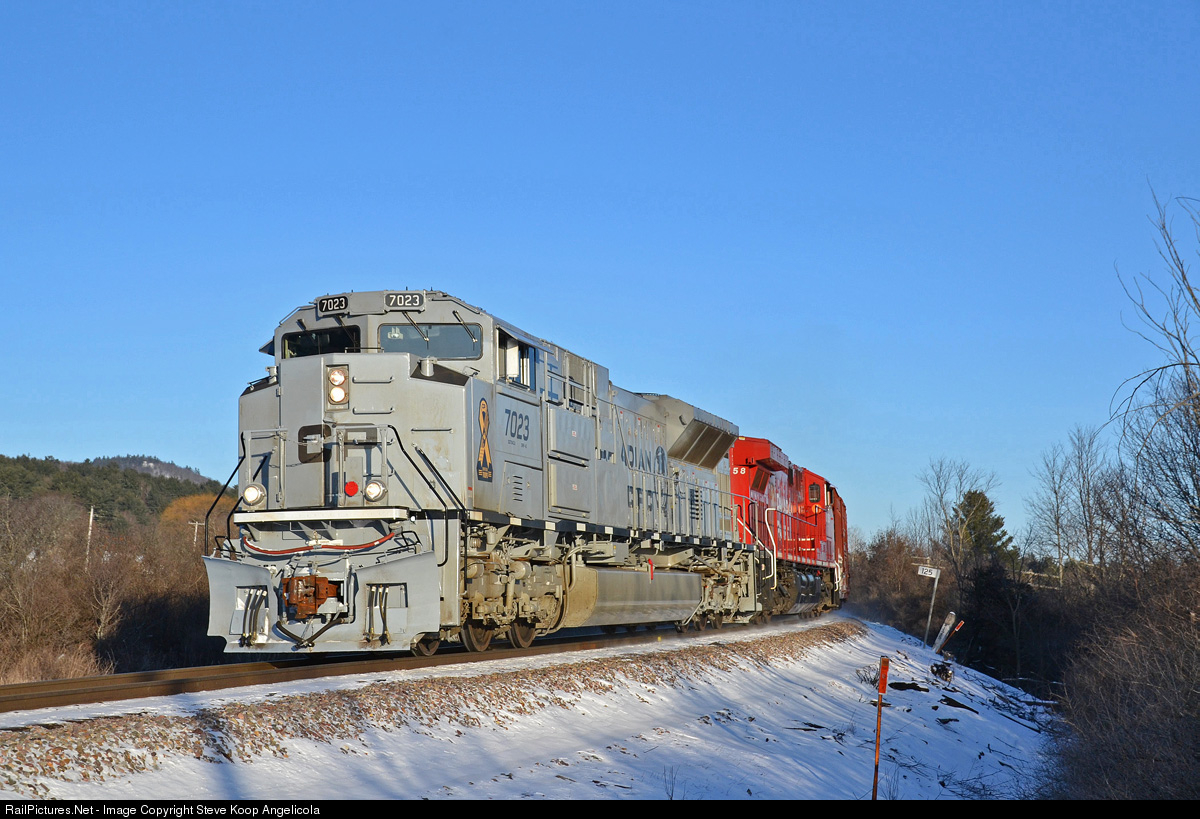 | Montreal to Saratoga Springs, NY daily manifest train train 252 approaches CPC 125 in Westport lead by CP 7023, one of the five newly painted SD70ACU's honoring Canadian and U.S. armed forces. 7023 sports a two- tone grey scheme designed after Canadian and American fighter jets. |