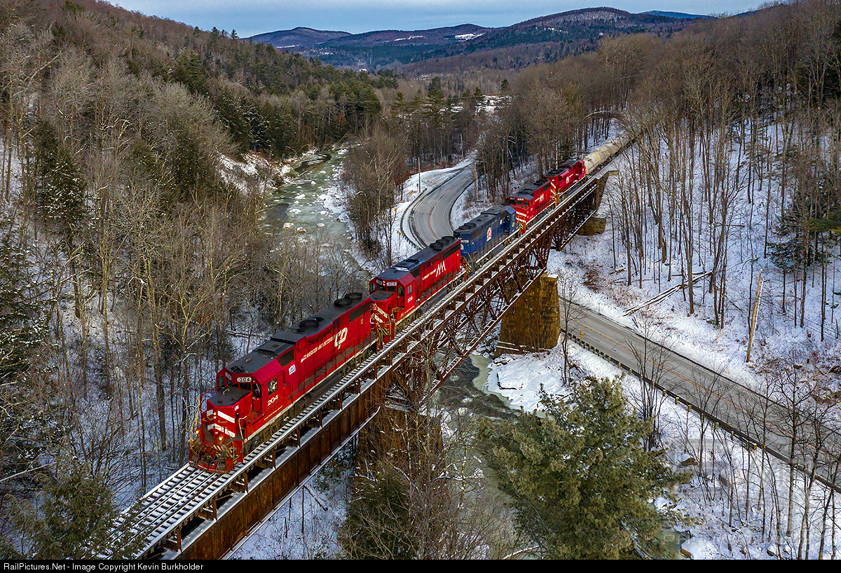 Green Mountain Railroad's Saturday Slurry train is seen with Vermont Rail System family representation on five locomotives, representing the Clarendon & Pitsford, Vermont Railway and the Washington County RR affiliates. The slurry train is seen crossing the Wells River at Cuttingsville, VT with CLP GP38-2 204 leading VTR GP40-2 308, VTR (Washington Co.) GP38-2 202, VTR GP40-2L 310 and VTR SD70M-2 432 on Saturday, December 21.