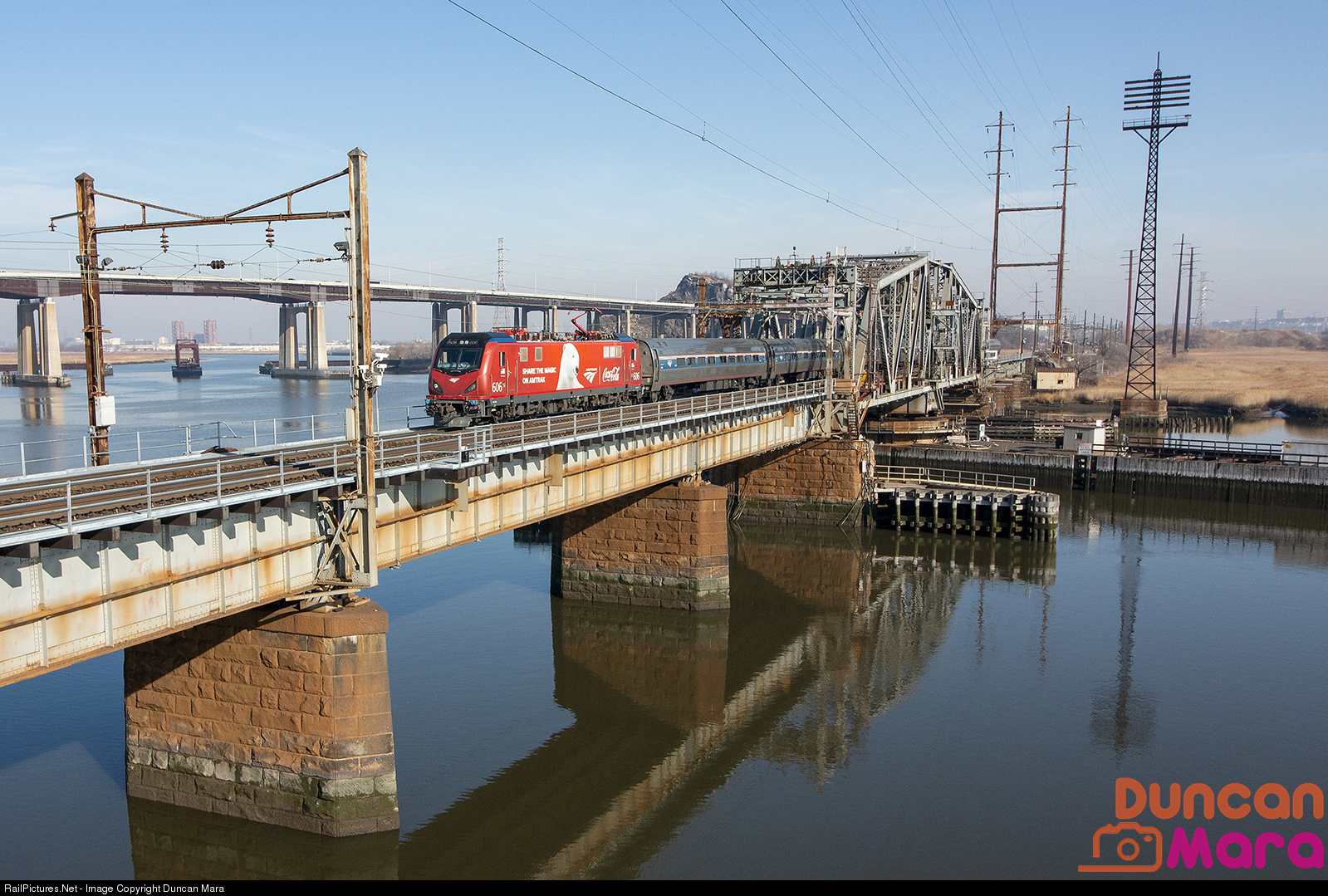 | Amtrak's Coca Cola Holiday wrapped ACS-64 leads train 157 across Portal Bridge on the Northeast Corridor. The unit was wrapped to celebrate Amtrak switching to Coca Cola products on their trains, but will only remain on the engine until mid-January. |