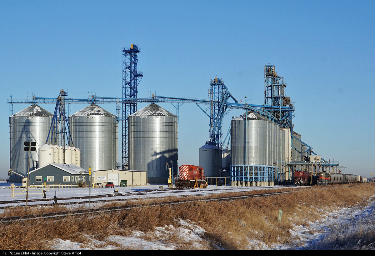 Leased Northern Plains Railroad SD40-2 5906 sits idle while former DMVW GP35 6327 loads cars at Providence Grain Solution's elevator in Gaudin. The elevator is located west of Bruderheim at mile 102 on CN's Vegreville Sub.