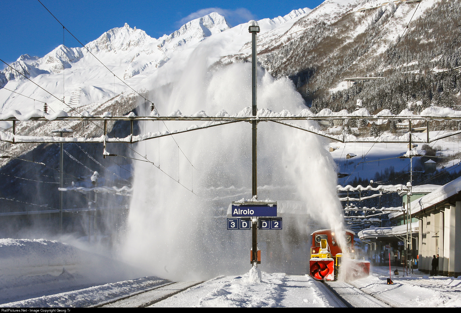 Snow blower XTm # 102 of the SBB is clearing track 2 in Airolo on a beautiful winter morning. The SBB had 9 of this small 200 Hp snow blowers, built in 1968, with 45 km/h max velocity.