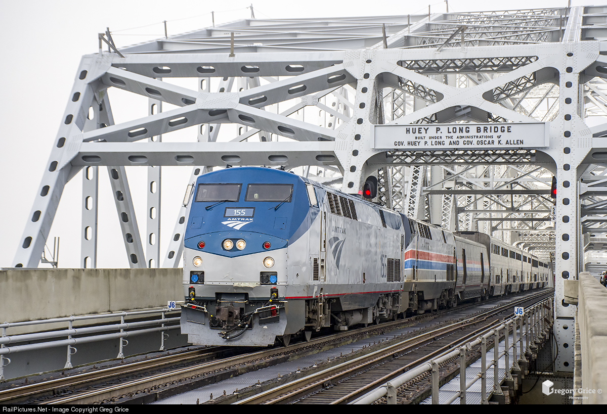 Amtrak's westbound Sunset Limited head west over the Huey P. Long Bridge shortly after starting it's run from the New Orleans Union Passenger Terminal. The Huey P. Long Bridge is a cantilevered steel through-truss bridge that carries U.S. Route 90 and the New Orleans Public Belt over the Mississippi River. It was first opened in December 1935. |
