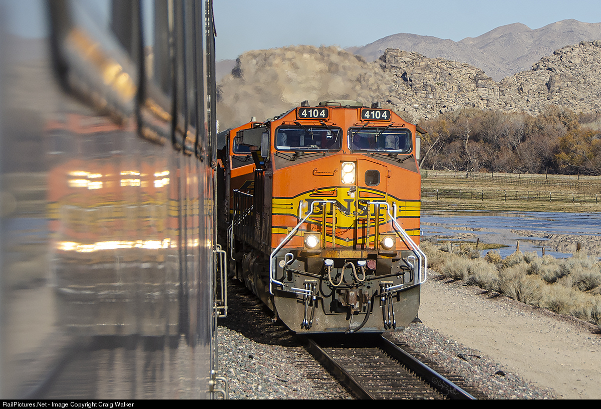 The BNSF 2019 California Division Christmas Train (O-SBDSBD3-16) is nearly at Victorville, where it will pick up additional volunteers. About a mile-and-a-half from the station in Victorville, the special meets westbound BNSF merchandise train H-BARSDG8-16 at Frost, along the banks of the Mojave River. BNSF Dash 9-44CW 4104, along with ES44C4s 7001 and 7028, ES44DC 7257 and ES44C4 6906, are the power for this train as it travels from Barstow to San Diego. (December 16, 2019) Photographed on railroad property with permission and full Personal Protective Equipment (PPE).
