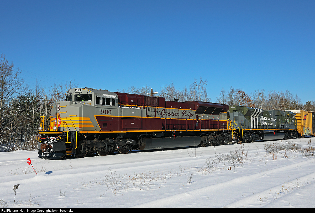 CP heritage 7010 and CP military tribute 6644 hold at CPC 36 just north of their Saratoga Yard destination as they wait on snow removal in the yard. They are on Montreal to Saratoga train 252 consisting of 81 cars that include 11 autoracks on the rear. CP 6644 wears the camouflage colors applied to Royal Canadian Air Force "Spitfire" fighter planes flown at the Allied invasion of Normandy, France, on June 6, 1944, 6 6 44. The sun has finally come out after a large 2 day early December snowstorm in NY's Capital District.