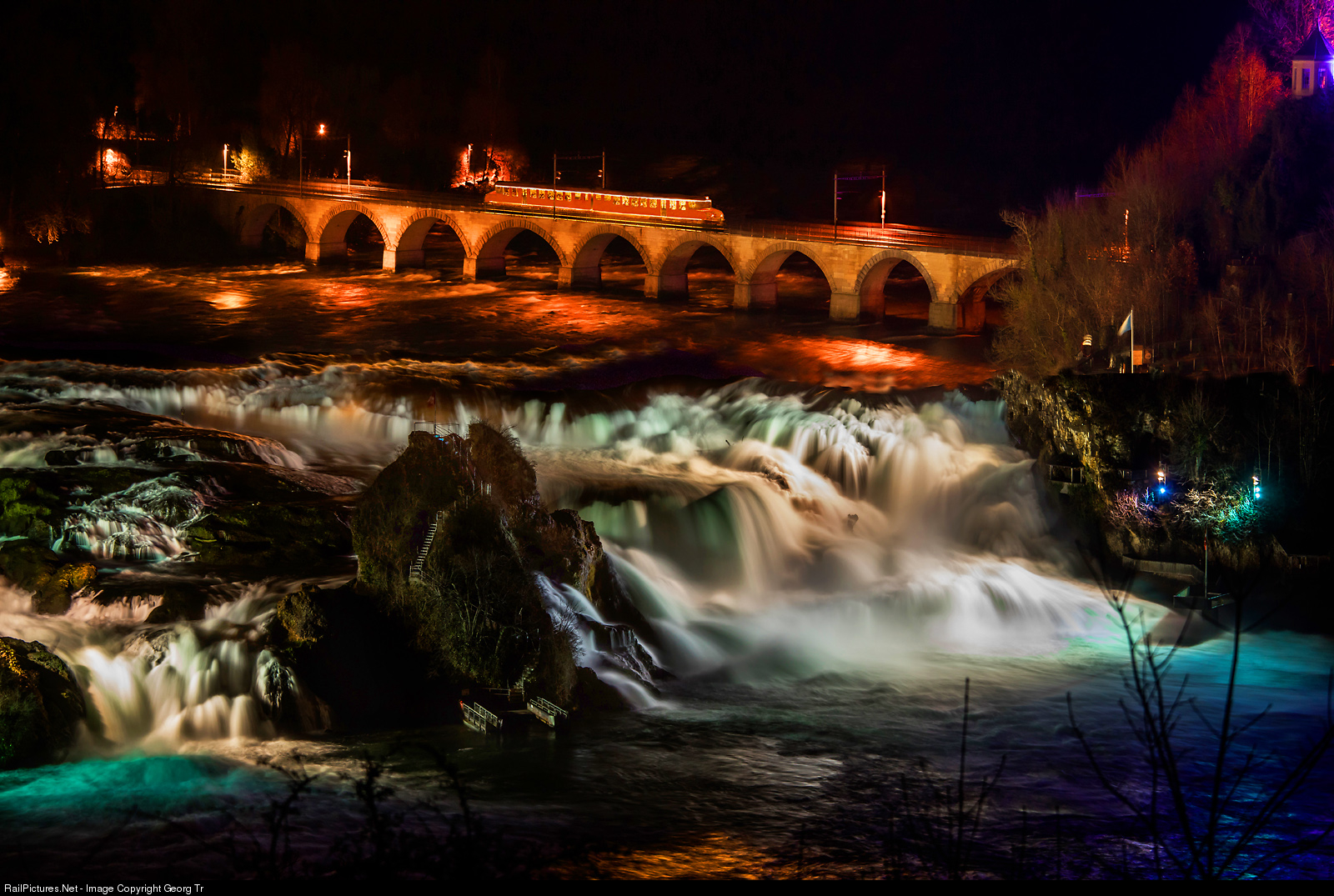 On christmas eve, the iconic double red arrow "Churchill-Pfeil" RAe 4/8 # 1021 of the SBB from 1939, made a festive round trip with about 100 guests, eating and drinking on the train. The 4 hours journey was from Zürich main station via Killwangen-Würenlos-Regensdorf-Bülach-Eglisau to Schaffhausen, and back via Andelfingen-Winterthur-Wallisellen to Zürich. The vehicle was decorated with LED-stripes on the roof edge and on the lower part of the body. Now the "Churchill-Pfeil" stopped for a few seconds on the 177 meter long bridge above the Rhine fall, between Neuhausen and Laufen castle. The stone arch bridge is part of the railway line from Schaffhausen via Andelfingen to Winterthur and was built in 1856. In the moment, about 382 m3 (or 100'000 gallons) water per second are falling down 23 meter and forming the 150 meter wide Rhine falls. The flow of water is slightly over the average in the moment.