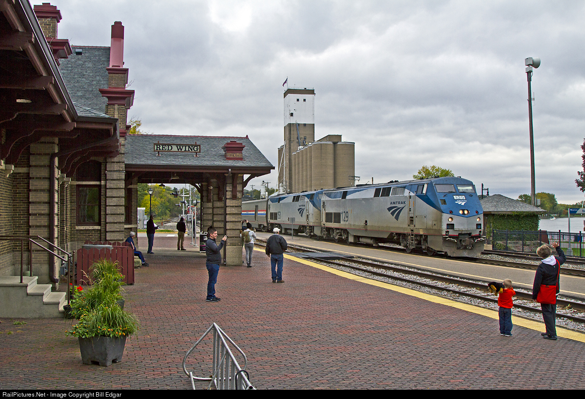 | Amtrak's Empire Builder rolls by the former Milwaukee Road depot as it slows for its stop at Red Wing, MN on a cloudy October morning. The station has been restored and is used by Amtrak. The Mississippi River is to the right of the locomotive. |