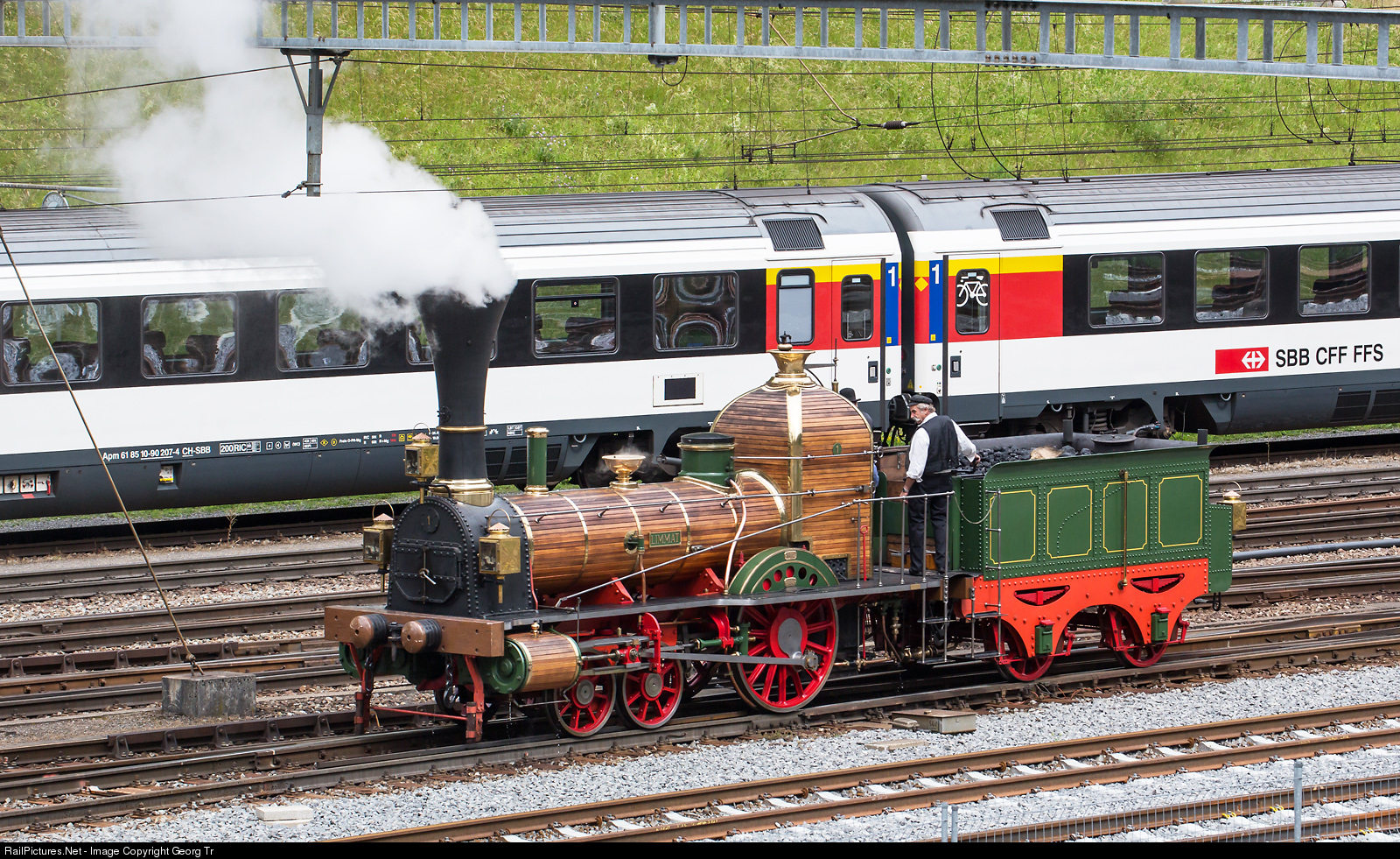 As a surprise, for the opening event of the new Gotthard Base Tunnel (GBT), the steamlocomotive D 1/3 # 1 "Limmat" was brought from Brugg (AG) by road transport to Erstfeld. The "Limmat" is an operational replica of the first locomotive in Switzerland, which ran between Baden and Zürich and was called the "Spanisch-Brötli-Bahn". The original "Limmat" was built in 1847 by Emil Kessler/Germany, the replica dates from 1947. The D 1/3 # 1 is running in the yard of Erstfeld during the large Gotthard Base Tunnel opening event.