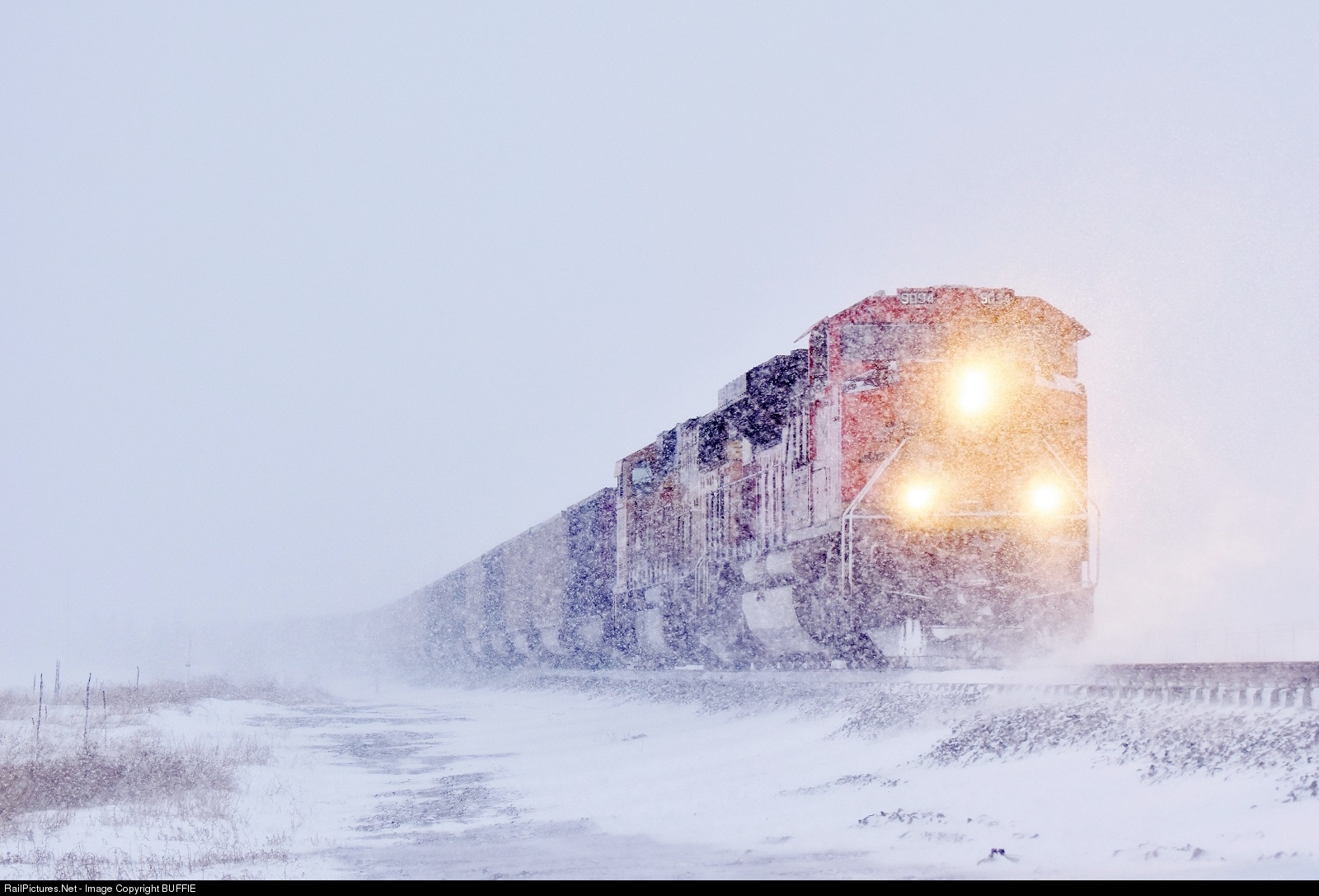 | The Colorado Front Range was socked with a strong blizzard, with sub-freezing temperatures and strong winds creating nearly whiteout conditions. BNSF 9094 (SD70ACe) runs head-first into the howling winds while leading a loaded coal train to Palmer Lake, Colorado. |