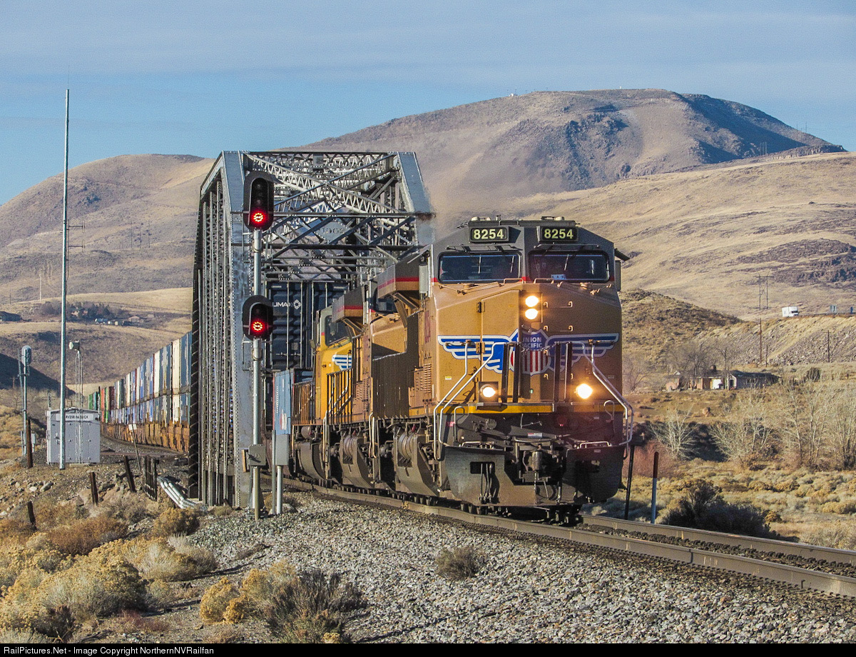 | Another addition to my shots of eastbounds at Patrick, UP 8254 roars through Patrick on the Nevada subdivision with a lengthy stack train bound for Salt Lake City. |