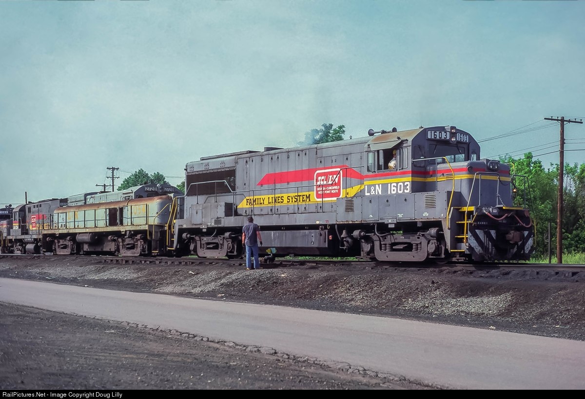 | Louisville & Nashville U25B 1603, paired with a slug cut down from an RS-3, goes to work in the yard in Corbin, Kentucky. |