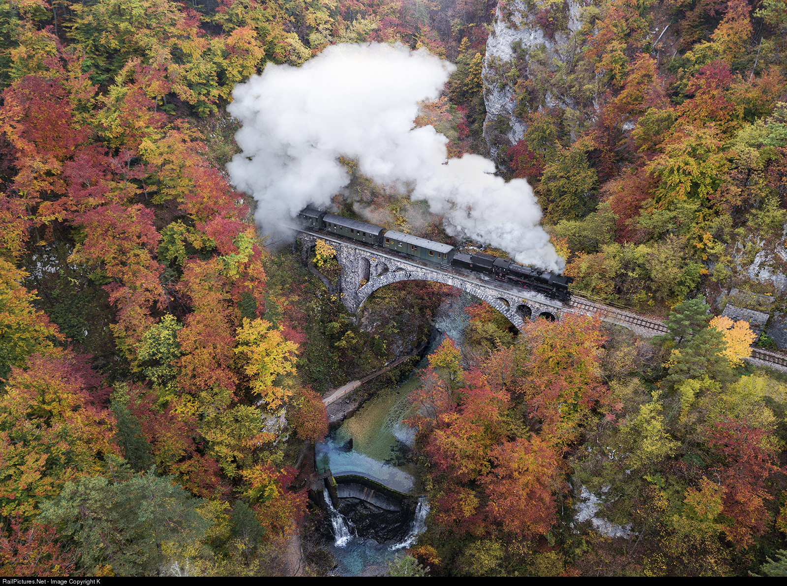 | Replicating the last century in all its glory: 33 037 starts to pull after exiting Vintgar-Tunnel over Radovna river. Nice detail is the driver hanging out of the cab, admiring Vintgar Gorge in these colors.