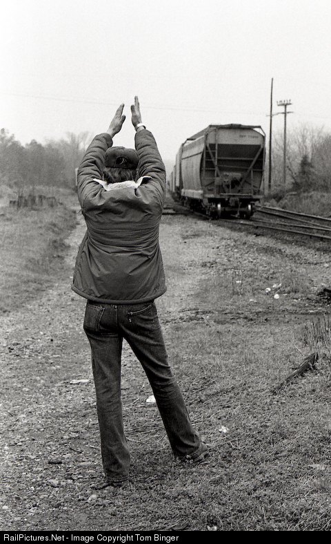 The brakeman signals the engineer at Missouri Pacific's interchange with the DeQueen and Eastern.