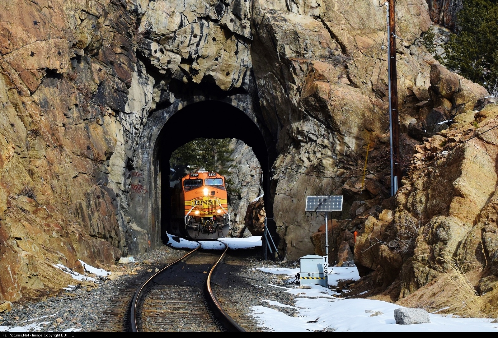 BNSF 5232 peeks around the corner of tunnel 29 as it winds its way through the canyon east of Pinecliffe, Colorado.
