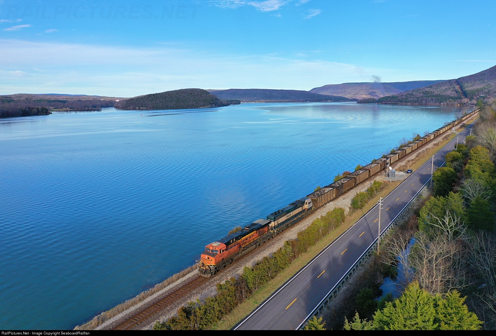 BNSF 5977 leads a coal train by Nickajack Lake on CSX's Chattanooga sub in Tennessee