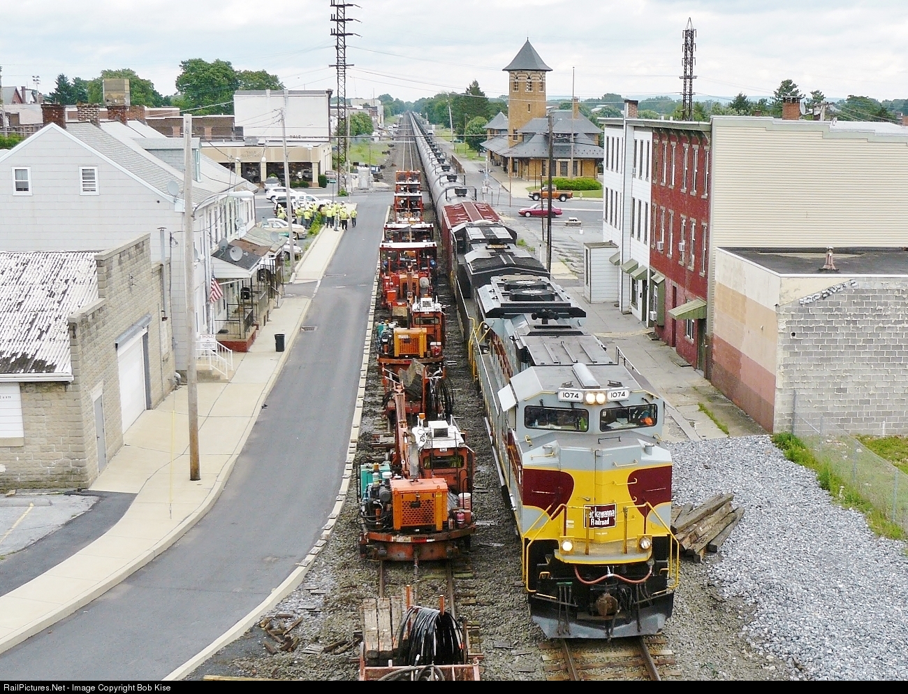 The NS track crew has cleared up by the old Railroad House Hotel in Lebanon, as the Lackawanna Heritage Unit heads west on No. 2 Track