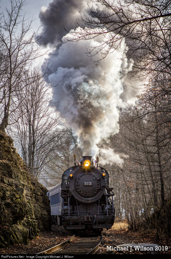 | "Rock Cut": CNJ #113's exhaust echoed off the rock walls just south of Minersville, Pennsylvania on November 30, 2019 as she headed home hauling Reading & Northern's Santa Special. |