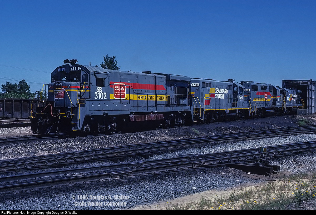 A string of Seaboard System locomotives in the yard in Hamlet, North Carolina, includes B23-7 3102 (ex-Seaboard Coast Line 5102), GP16 4794 (ex-SCL 4794, ex-SCL GP7 760, nee-ACL 172), GP38-2 6058 (ex-SCL 6058) and B36-7 5890. (September 14, 1986)