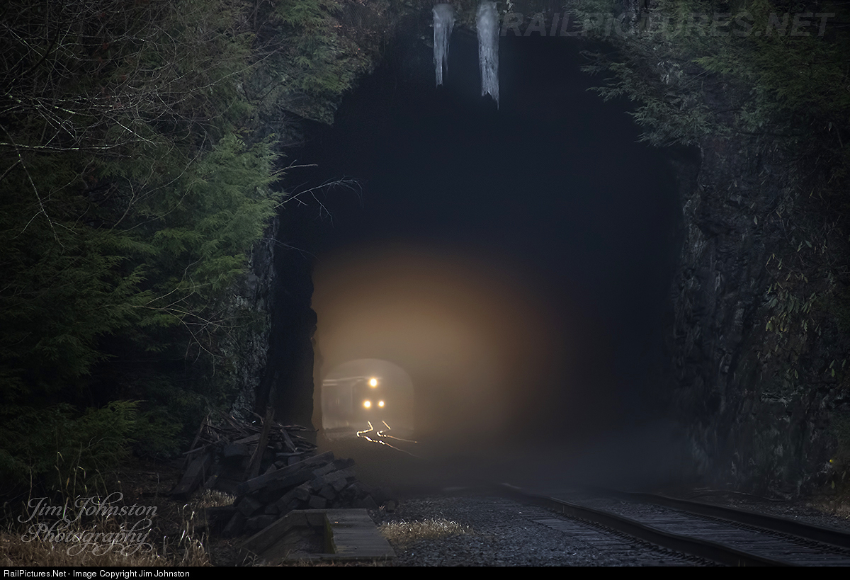A pair of former CSX/Seaboard SD50s RBMN 5019 and 5021 lead a manifest train about to enter the tunnel at Tamaqua on a foggy, misty afternoon.