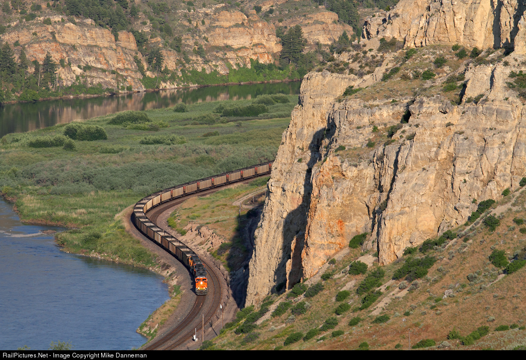 | Heading back to Powder River Basin, an eastbound BNSF coal empty snakes below the cliff at Lombard, Montana, on the morning of July 6, 2018. |