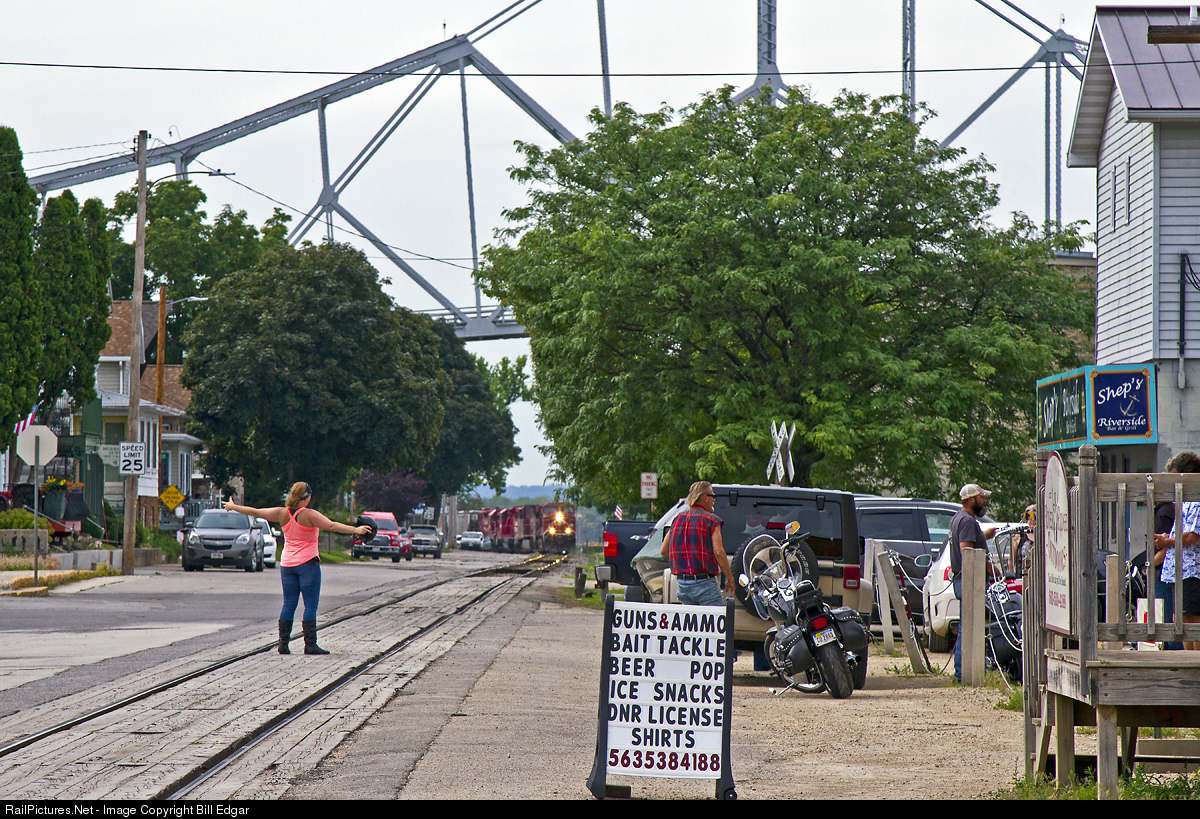 Time for a game of "chick-hen"? CP 8846 eases into Lansing, IA with a southbound freight appearing to be in for a face off with a formidable biker chick. Fortunately her need to quench her thirst at Shep's got the better of her, and the train rolled through town without incident (this time).