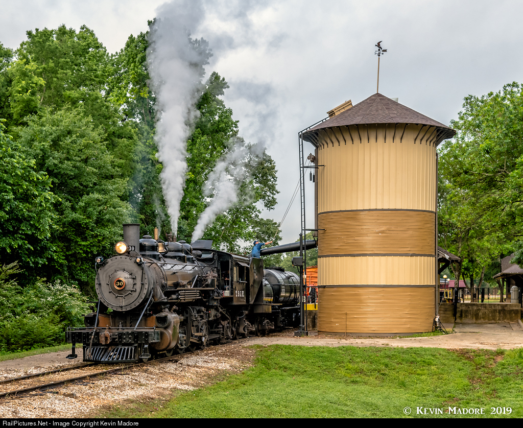 | Tanking at Palestine. Tremont & Gulf #30 has her photo freight in tow as she pulls up to the very unique-looking water tower in the yard at Palestine, TX. In this case, it's all for show, because I'm told that the tank is not actually working at the present time. The Texas State Railroad's locomotives get their water at other servicing facilities in the yard. |