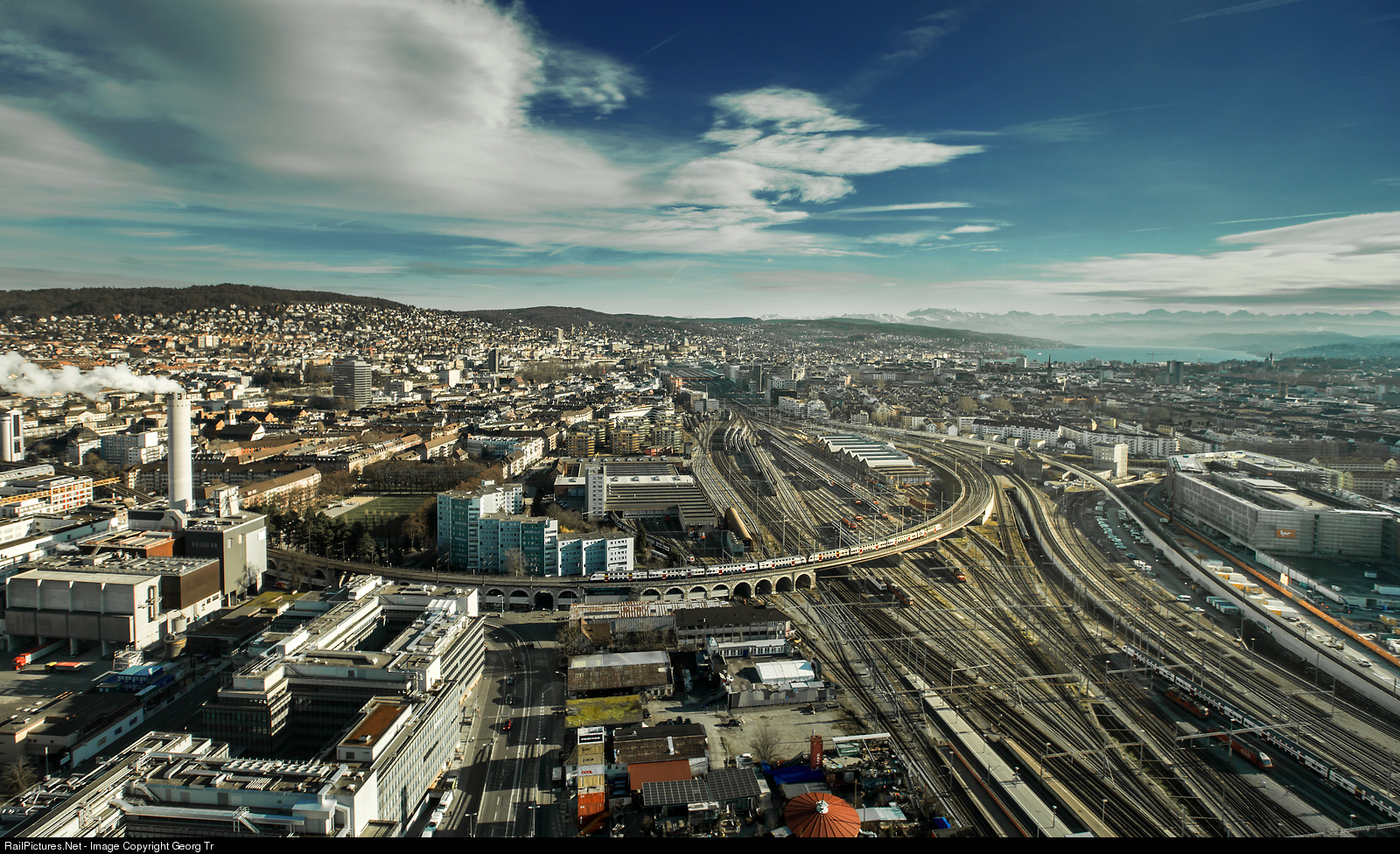 Wide angle view from Zürich's Prime Tower about 120 meter above ground to the town, large track layout of the SBB and Lake Zürich and the alps in the background. On the curved Wipkinger viaduct is the S 24 service 20452 from Zug via Thalwil-Zürich-Oerlikon-Airport-Winterthur to Weinfelden with two RABe 514 SIEMENS doubledeck commuter trains. In the middle of the picture, behind the viaduct, is the "Depot G" shed, which will closed down in the next years and will be overbuilt with appartments mainly. The main hall of Zürich HB (main station) is in the middle background. In the curve of the Wipkinger viaduct is the shed of the "Depot F", now used by the infrastructure. On the far right is the new very large building for police and justice of canton Zürich (PJZ, Polizei und Justizzentrum). In the far background right is Lake Zürich and the Alps.