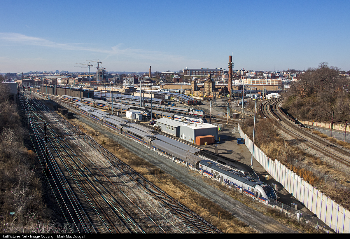 | A genset shoves a cut of Amfleet coaches towards Washington Union Station for an outbound train as they pass MARC and VRE equipment at Ivy City. Some infrastructure from the steam era can be seen above the switcher. |