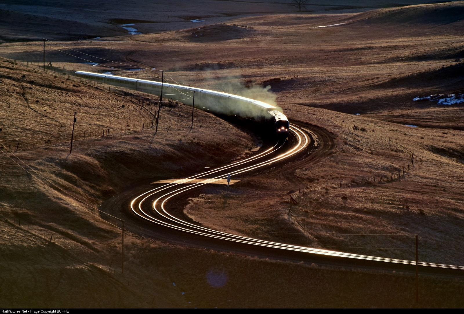 | The early sunrise washes the valley and the track of the Big Ten Curve in a golden hour glow, catching the Amtrak Ski Train as it makes the morning run from Denver to the Winter Park Ski Resort nestled high in the Colorado Rocky Mountains. |