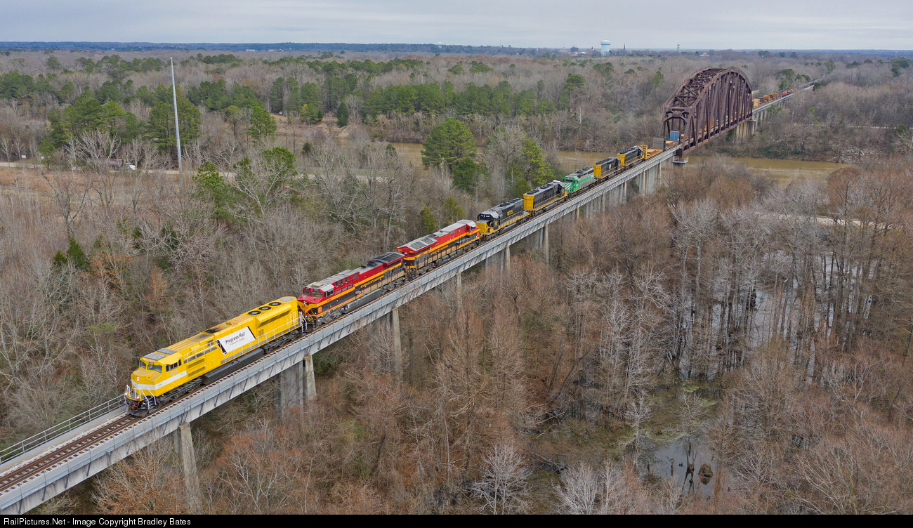 Alabama Southern Train 112, the Reform, AL to Artesia, MS turn, heads West as they cross the Tombigbee River in Columbus, MS. The EMDX 7209 and the two KCS Locomotives had been used a couple of days prier to pull an Oil Train to Hunt Oil in Tuscaloosa, AL, then got turned back on ABS Train 112 to KCS.