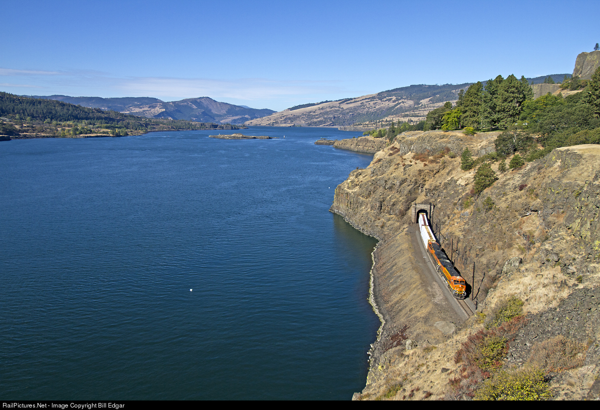 | An eastbound freight make good time through a series of four tunnels just west of Lyle, WA as it progresses from Vancouver, WA to Pasco on the former SP&S mainline. |