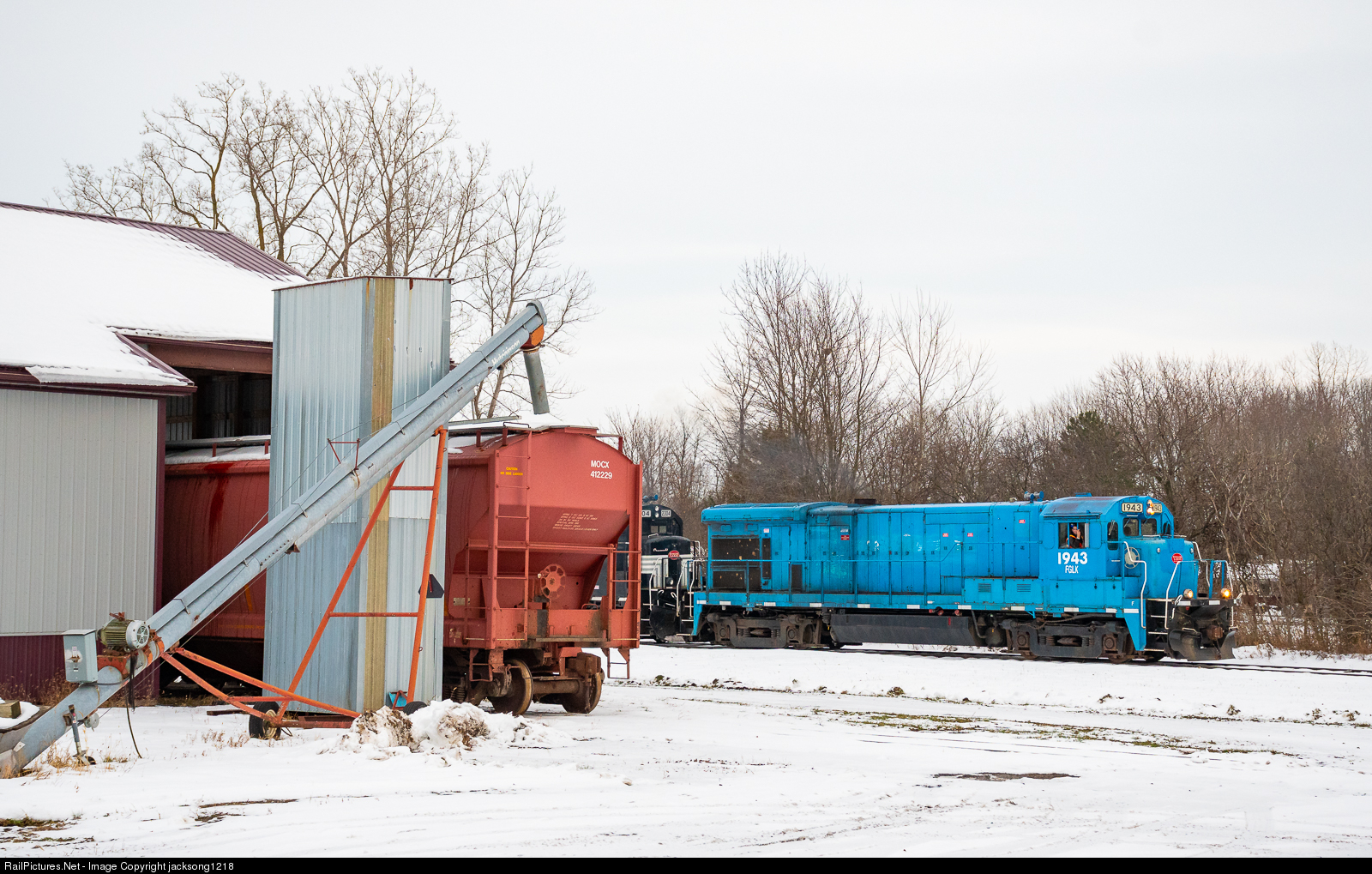 Finger Lakes Railway train GS-2 passes a grain transfer facility just outside of Geneva, NY on its return westbound run from Slovay, NY. The lead unit, 1943, has since left the Finger Lakes mainline bound for captive switching duties in Fulton, NY.
