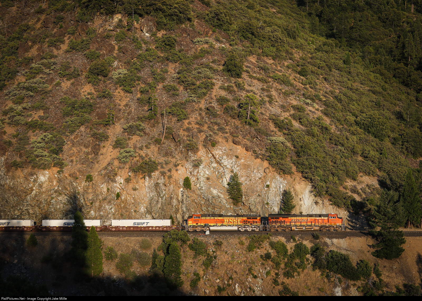 | Even during the long summer days of August, the shadows of the Feather River Canyon can quickly cloak the mountains in darkness. Here, BNSF 6821 catches the last few rays of sunlight as it heads up a westbound Swift intermodal train at Rich Bar. This would be the last pocket of sun the train would see until the following morning. |