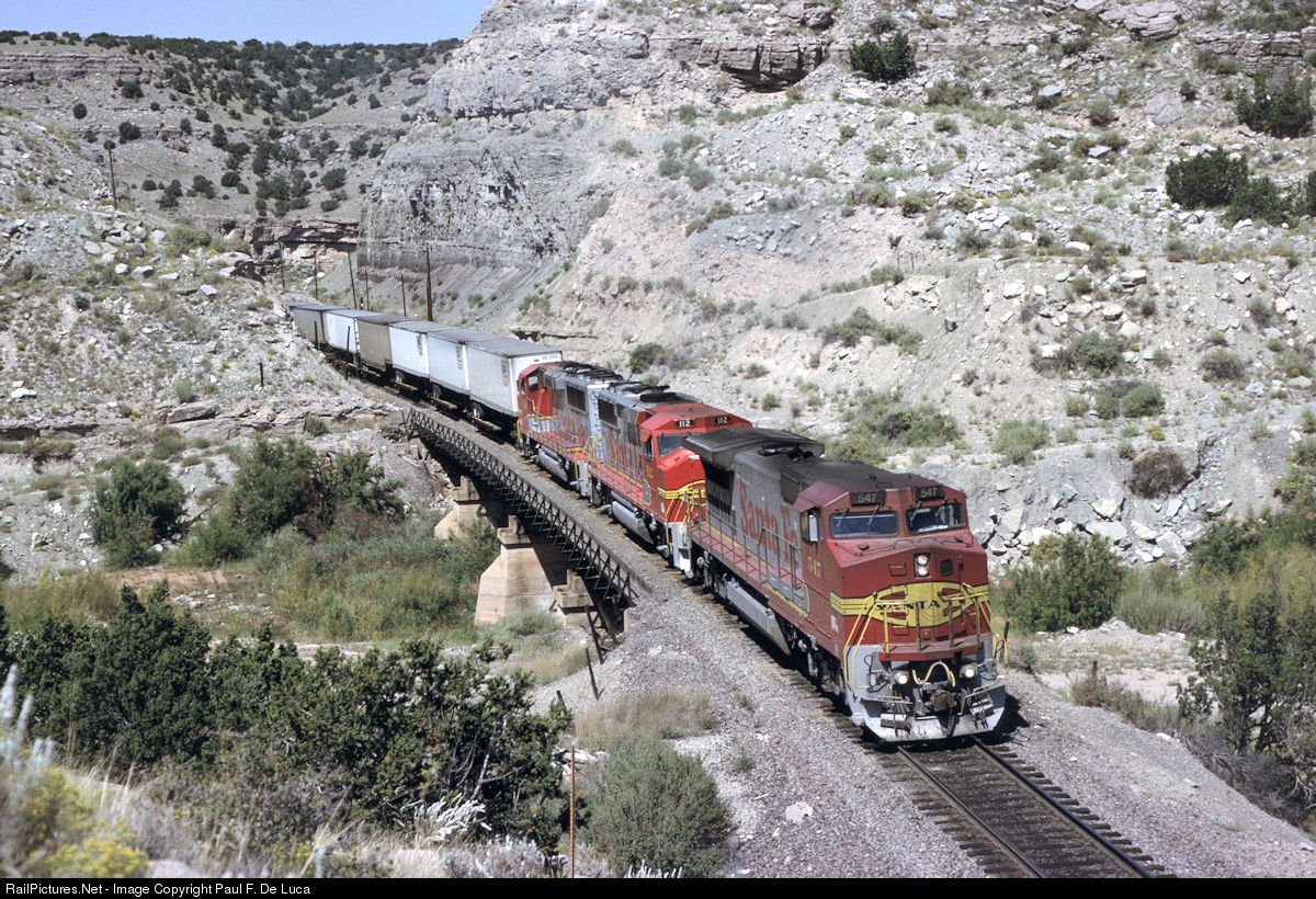 | My only time at Abo and Raton was in 1992 on the heels of chasing ATSF 3751 from KC to Alberquerque and riding a C&TS photo freight. A morning walk in from the Highway 60 overpass near Scholle was a surreal experience, walking up and down the hills along the pole line and camping out for trains at some nice overlooks. One catch of the morning were these Warbonnets climbing the canyon with EB intermodal. |