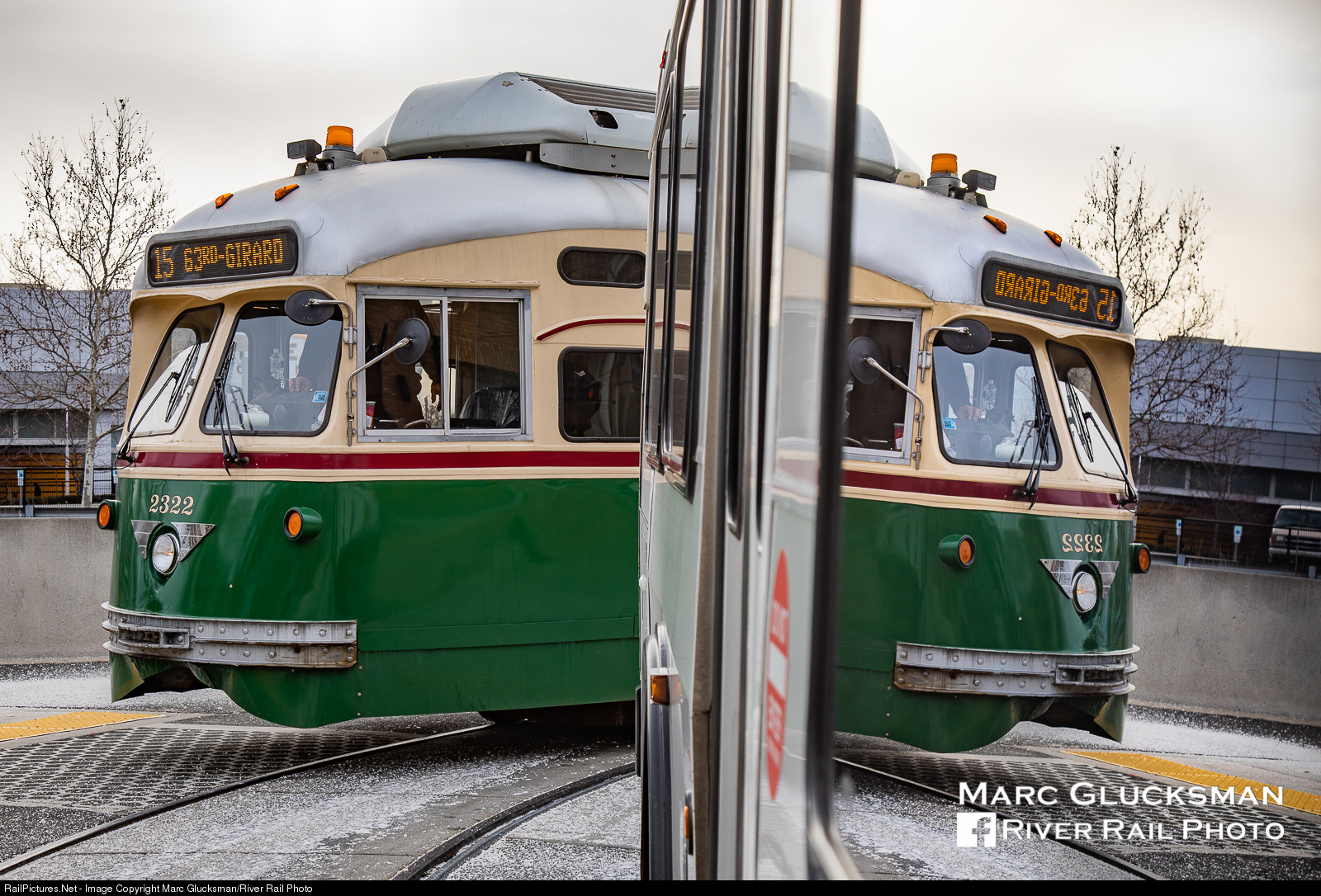 Reflecting on a the future of the Route 15. Septa's PCC-II 2322 stops at the Sugar House Loop on the afternoon of January 18, 2020, its replacement sits ahead ready to depart. SEPTA has announced that diesel buses will replace Route 15 trolleys beginning Sunday, January 26, 2020, but the failure of many cars in the fleet has actually pushed the date one day earlier.