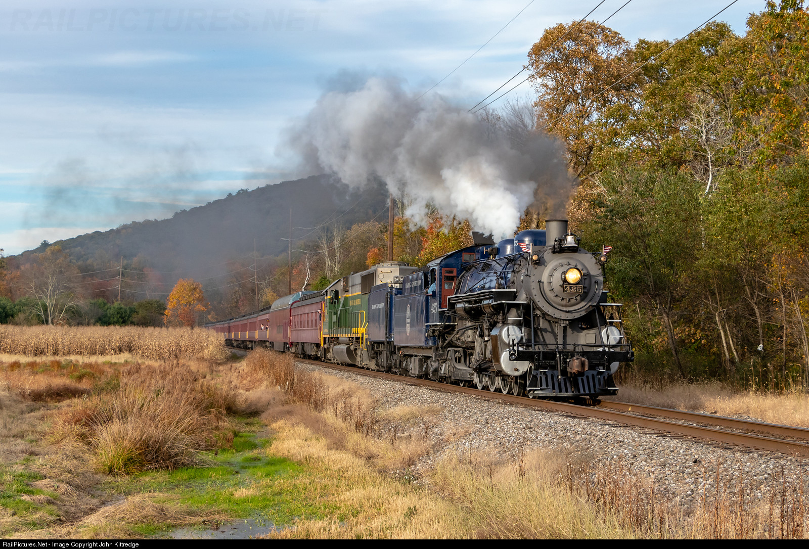 | Reading & Northern 4-6-2 425 and it's SD50 companion race through the late evening light in the farmland near Molino, PA as the train makes its way back toward Reading. |