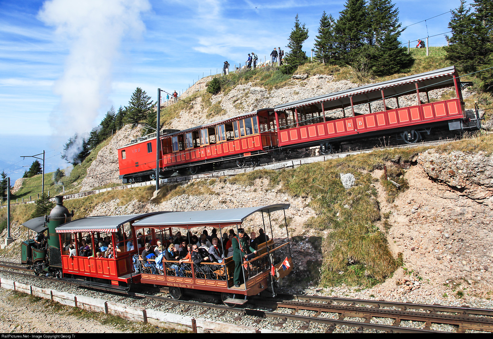 | Spectacular parallel run between Rigi Staffel and Rigi Kulm. On the track of the former Arth-Rigi-Bahn in the foreground is cogwheel steamlocomotive H 1/2 # 7 from 1873 with cars B # 5 from 1871 and B # 11 "Bambus" from 1889. On the track of the former Vitznau-Rigi-Bahn in the background is electric cogwheel locomotive He 2/2 # 18 from 1938 with cars B # 15 from 1899 and B # 2 from 1871. |