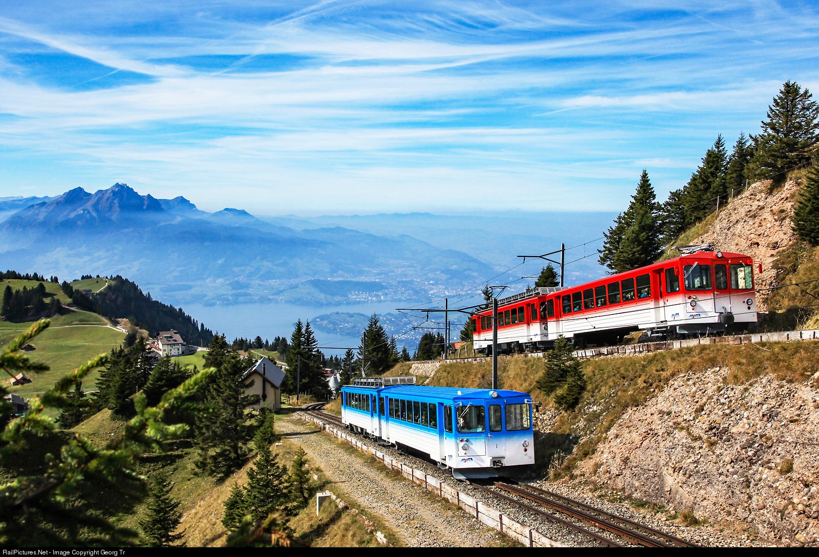| Parallel run of cogwheel push-pull trains of the Rigibahnen between Rigi Staffel and Rigi Kulm. On the left BDhe 4/4 # 15 with cab car Bt # 25 from Arth Goldau, on the right BDhe 4/4 # 21 and cab car Bt # 31 coming from Vitznau. The pantograph on the cab car Bt # 31 serves for ice scratching in harsh winter conditions. |