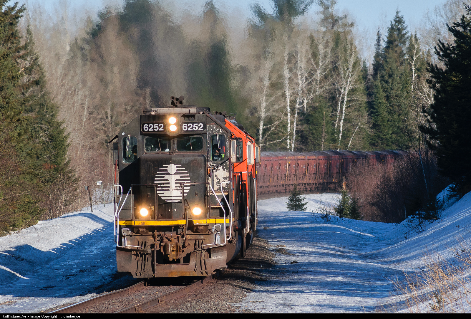 The sun is shining on a March morning as former Illinois Central SD40-3 6252, still wearing the "death star" paint scheme, leads loaded ore train U717 through the s-curve just south of Culver, Minnesota.