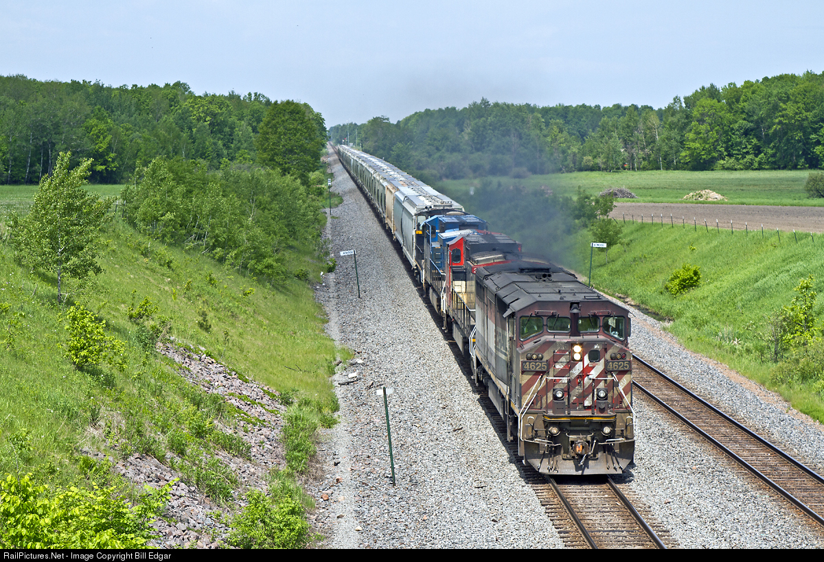 | BCOL 4625 (CN 4625) leads a colorful consist south on a sand train that originated in Poskin, WI near Barron. The fourth unit is an SW1500 owned by the sand plant, likely headed to Stevens Point for maintenance. It would be nice to see a wash job on the former BC Rail unit. |