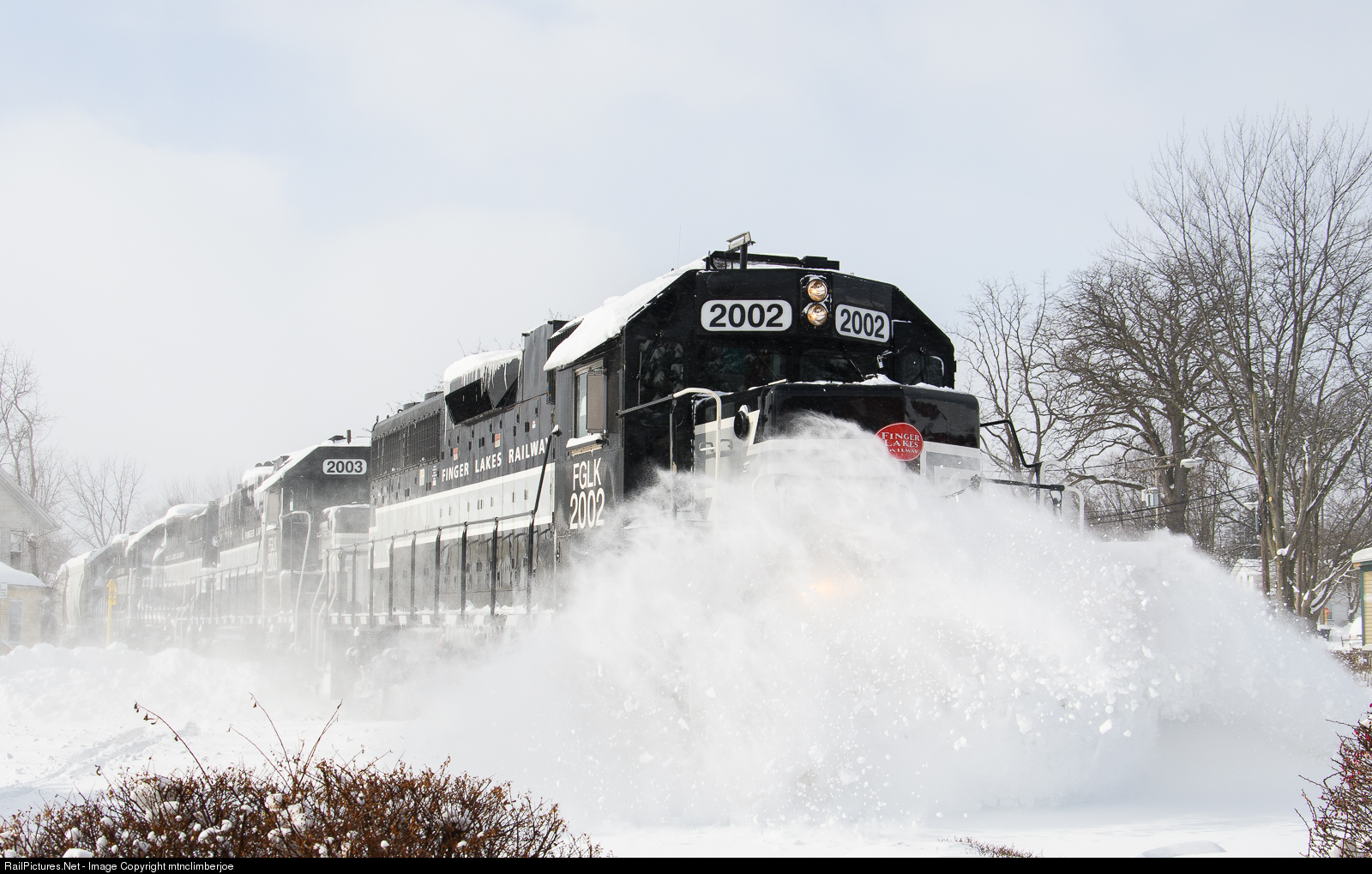| A quartet of Finger Lakes Railway GP38-2's are smashing through snow drifts from Winter Storm Harper as they head east through Seneca Falls, New York. The GS-2 turn to Solvay is the first train to clear the line after the snow fall. |