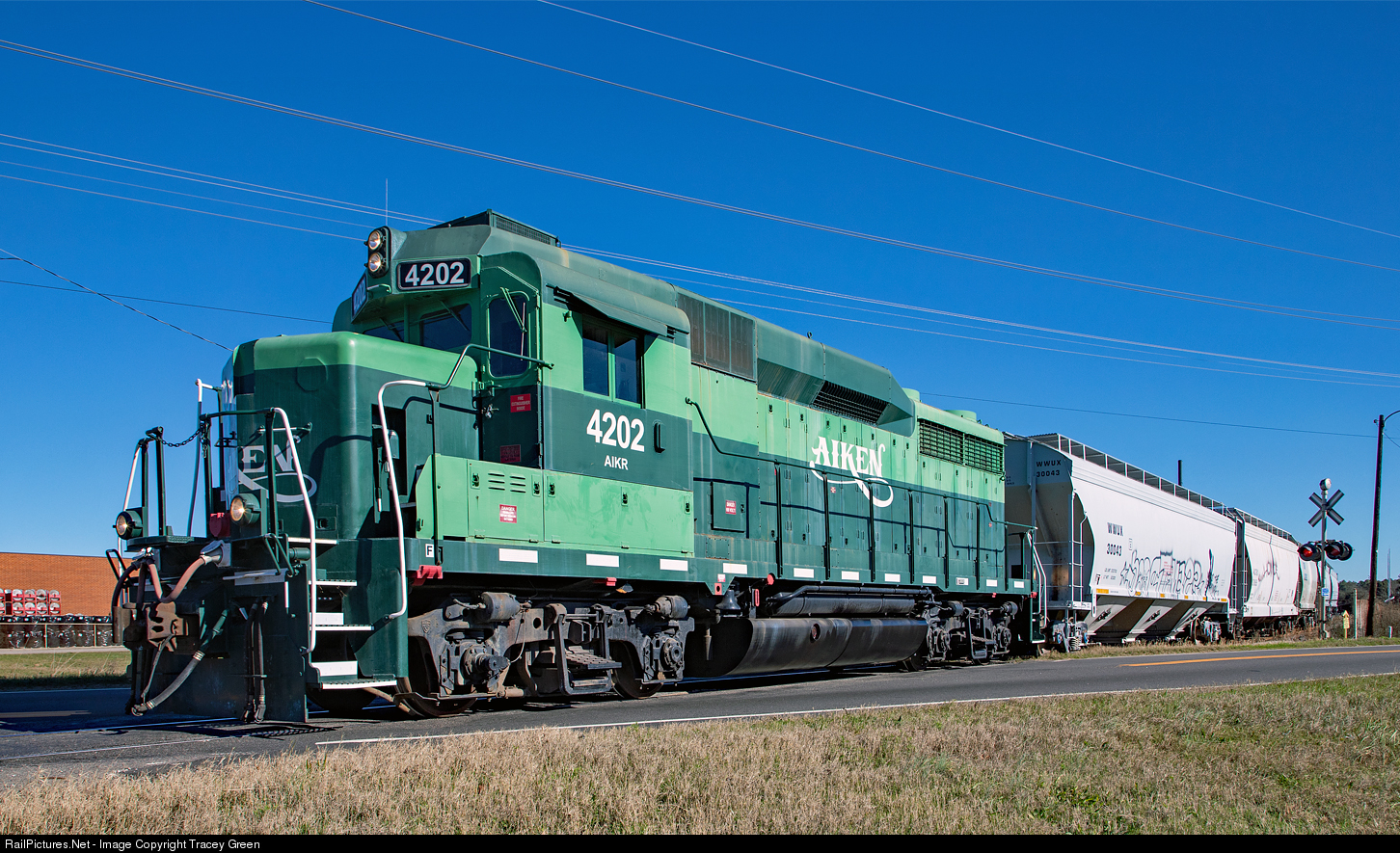 | Road Crossing. AIKR 4202 leaves the AGY facility in Aiken, SC to return to the Southern's old SA line, which is part of the line that originally ran from Branchville to Hamburg and essentially is the original South Carolina Canal and Rail Road Company (later South Carolina Railroad) line, and it will then head back to the yard in Aiken. |