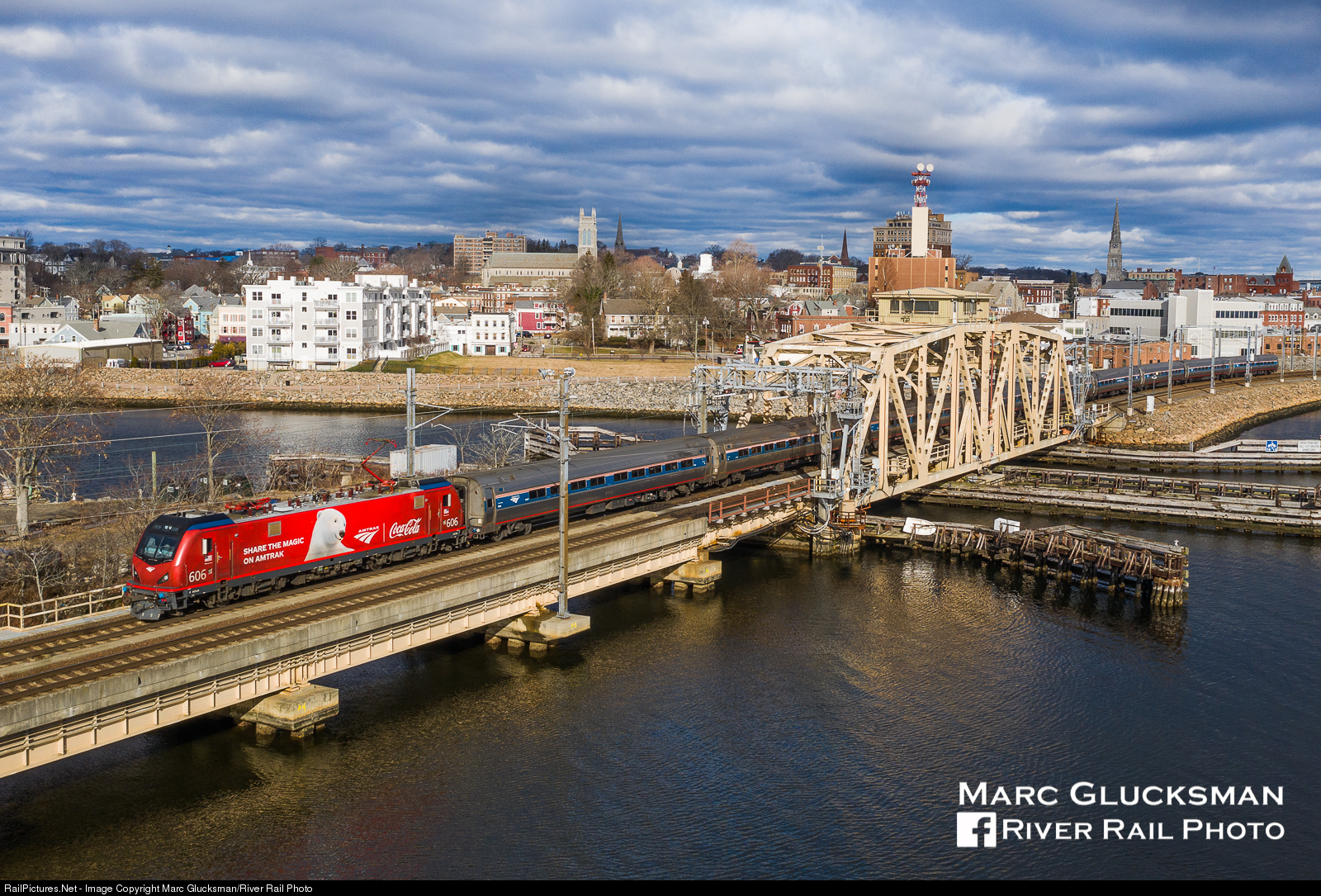 You've Had Too Much Coke, Now It's Time For Rehab. For many weeks the eyes of railfans have turned to the Amtrak Northeast Corridor, awaiting reports of sightings of the Coca-Cola wrapped ACS-64 606. But January 31, 2020 will be remembered as the day the red music died as the wrap was pulled off at Ivy City. Pictured here on Sunday, January 5, 2020, Amtrak Train 99 crosses Shaw's Cove in New London, CT on the way to Washington DC. We will miss you Polar Bear!